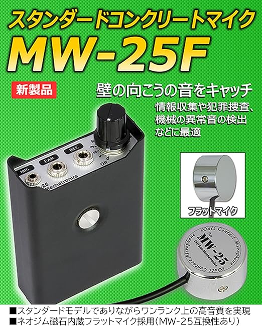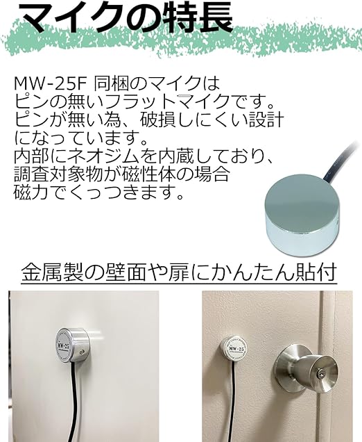 【磁石内蔵のフラットマイク採用】高音質マイク採用のスタンダードコンクリートマイクMW-25のをベースに、コンタクトマイクにピンが無く破損しにくいフラットタイプを採用しました。また、マイクにネオジム磁石を内蔵しマイク設置面が磁性体の場合、強い磁力で固定できます。