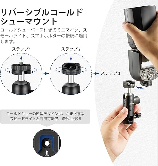 【1/4"ネジ付きボールヘッド】ミニヘッドは360°のフル回転と90°の傾斜運働を持っていて、ネジノブで固定しながら、デバイスを任意の角度に配置できます。1/4"のネジは、DSLRカメラやリングライトからアクションカメラやフィールド モニターまで、幅広い機器に適合します。