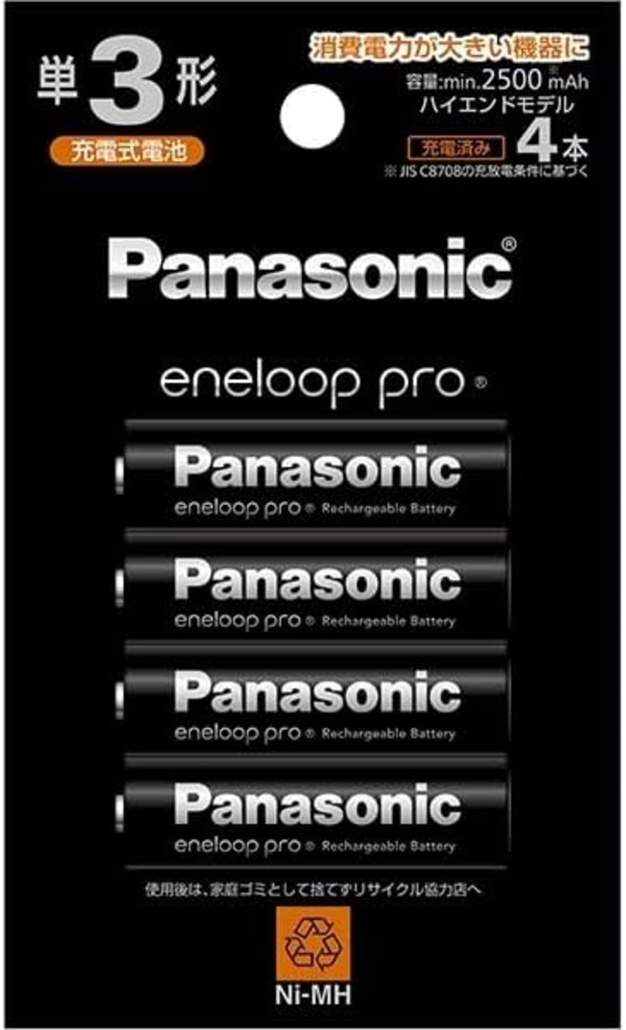 パナソニック eneloop pro 単3形充電池 4本パック ハイエンドモデル BK-3HCD/4H 充電式ニッケル水素電池 NI-MH AA battery min.2500mAh 150回繰り返し 充電済 日本製 〔BK-3HCD/4HA 同等品〕