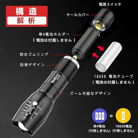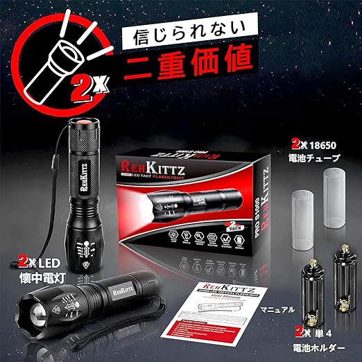 REHKITTZ LED懐中電灯 強力 超高輝度 フラッシュライト コンパクト 懐中電灯 電池式 18650と単四電池対応 ハンディライト 高耐久性 懐中電灯 小型 5つモード ハンドライト ズーム可能 防災 地震 登山 夜釣り (2個セット) a