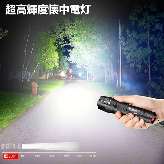 「超高輝度かつコンパクトなLED 強力 懐中電灯」当社の明るいLEDライトは、最大1600ルーメン(バッテリー100%時),市場の90%の同類商品よりも広範囲に照明できる新しいランプビーズを採用しており、照射距離は300メートルです,強力な明るさと幅広いビームで部屋全体や裏庭を簡単に照らすことができます。懐中電灯 防水のサイズはわずか3.7 x 3.7 x 13.1 cmで、重さは120グラムと非常に軽量です。さらに、このフラッシュライト 強力はランヤードデザインと滑り止めハンドルを採用しており