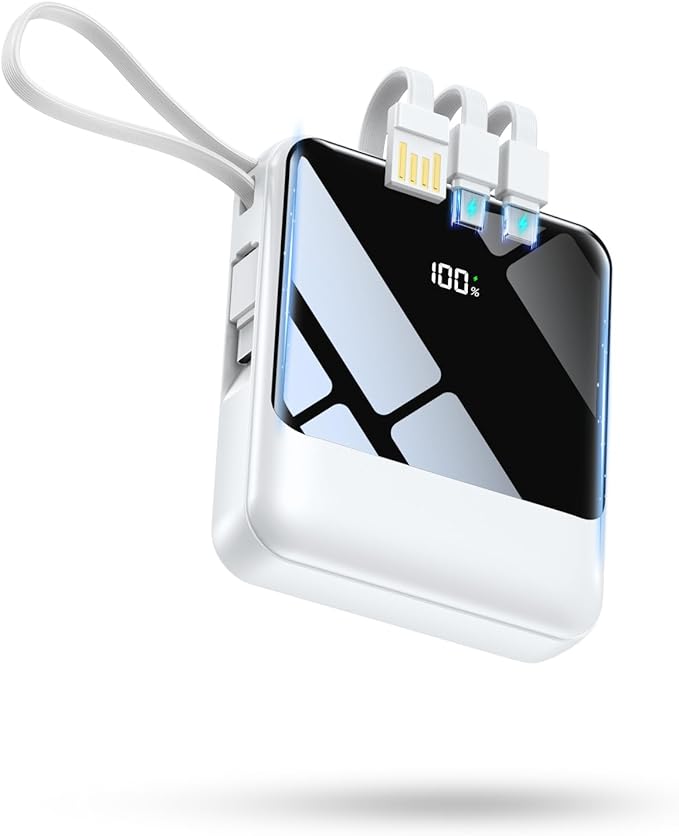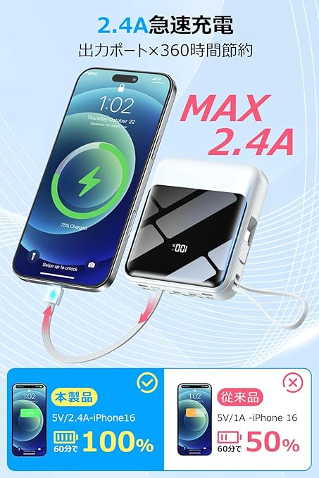 【2025業界新設計モバイルバッテリー!優れた実用性】外出するために設計された超軽量モバイルバッテリーが登場し、さまざまな煩わしい充電線を持ち込む必要がなく、モバイルバッテリーの内蔵ケーブルは出力と入力の需要を実現することができます。4本内蔵ケーブルで各種機器の充電も可能です。更に2個USB出力口付きで、最大5台の設備を同時に充電することもでき、友達家族と一緒にいるときは、必要に応じてみんなで充電することができます。携帯性を重視する方には、ケーブル内蔵型のモバイルバッテリーがおすすめです。外出す