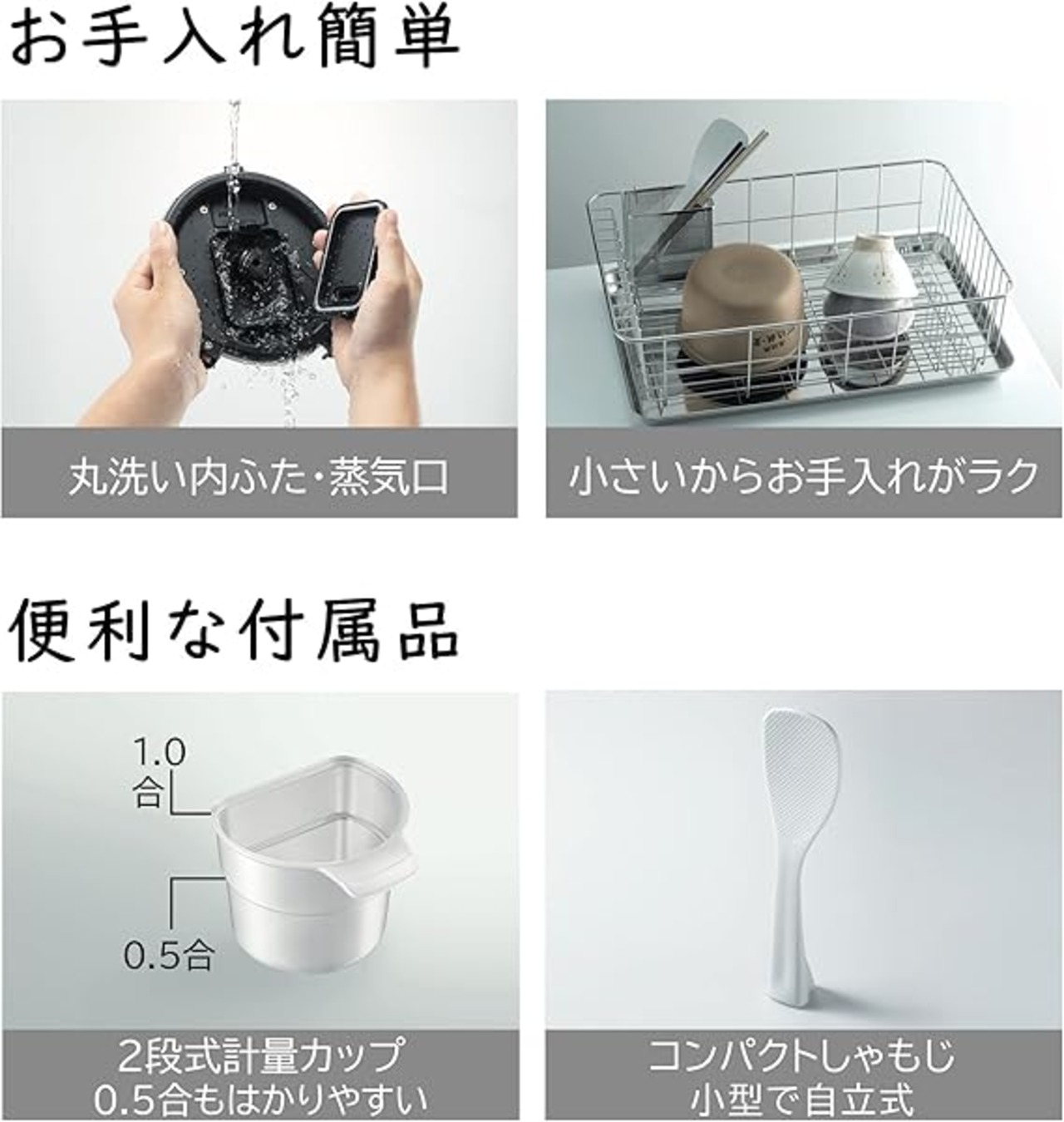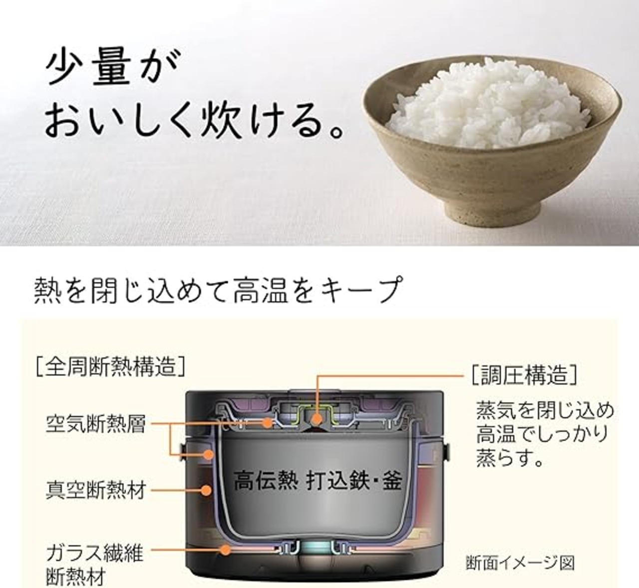 [全周断熱構造]等で熱を閉じ込めて高温をキープするから、少量がおいしく炊ける。