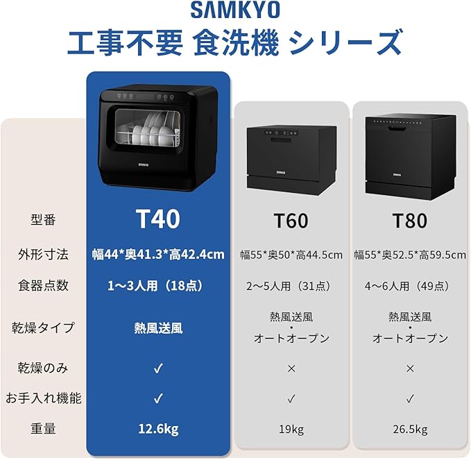 食洗機 工事不要 1〜3人用 家庭用 18点入り 食器洗い乾燥機 乾燥のみ機能対応 熱風送風乾燥機能 食洗器 食器洗浄機 給水バケツ付き SAMKYO T40 ブラック a