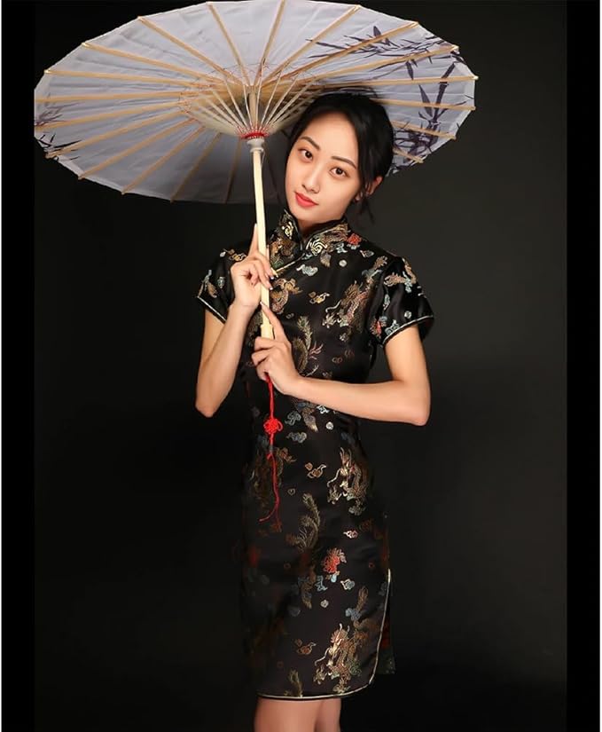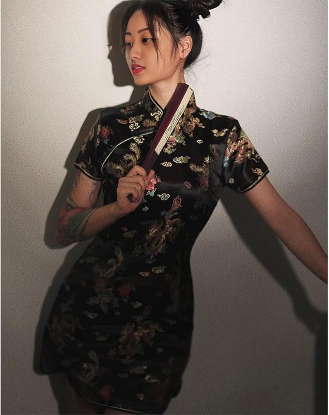 [Limspace] チャイナドレス ミニ チャイナ服 レディース サテン ワンピース 半袖 膝上 梅花柄 龍と鳳凰柄 ファッション エレガント 旗袍 ダンス 舞台衣装 パーティードレス 結婚式 ハロウィン コスプレ衣装