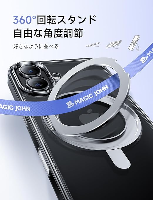 MAGIC JOHN iPhone 16 用 ケース ハード クリア 高透過率 耐黄変 カメラコントロールに対応 スタンド付き 360°回転 MagSafe対応 a