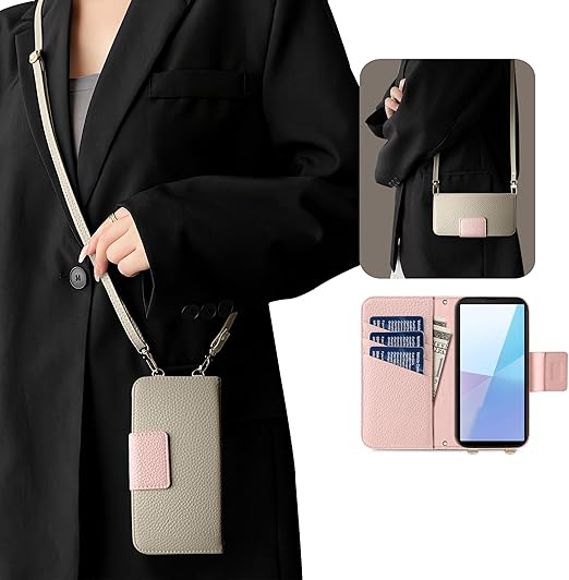 Kahper For arrows We2 ケース 手帳型 ショルダー バイカラー スマホケース アローズ F-52E おしゃれ かわいい 女性 レトロ arrows we2 f-52e ケース カード収納 シンプル 上品 we2 カバー マグネット式 スタンド機能 肌感レザー 携帯ケース f-52e ストラップ 人気 エレガント レディース 手作(グレー メ ピンク) a