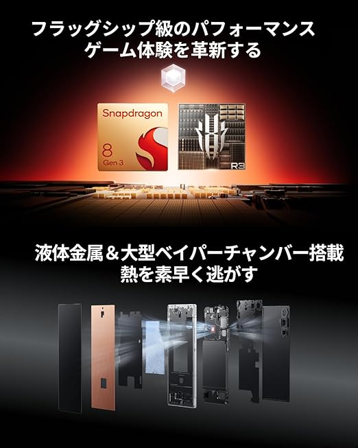 【Snapdragon 8 Gen 3搭載】Snapdragon 8 Gen 3+専用ゲーミングチップ「RedCore R3」で超高速処理を実現。AIがゲームを自動最適化し、滑らかでパーソナルなプレイ体験を提供します。重いタイトル「原神」、「崩壊:スターレイル」、「勝利の女神:NIKKE」、「アイドルマスター シャイニーカラーズ」などでも最高設定でスムーズに遊べます。
