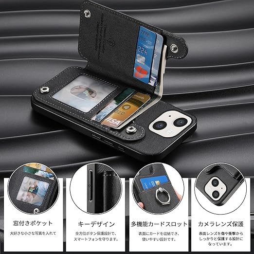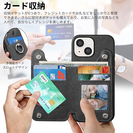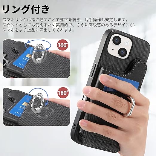 For iPhone 14 / iPhone 13 ケース 手帳型 リング付き アイフォン 13 / 14 スマホケース iphone 14 ケース 耐衝撃 背面 カード収納 あいふおん14ケース いphone14 カバー PUレザー 薄型 いphone13 スマホカバー 財布付き カメラ保護 スタンド機能 RFIDブロッキング 360°回転 スナップボタン TPU 軽量 おしゃれ ブラック a