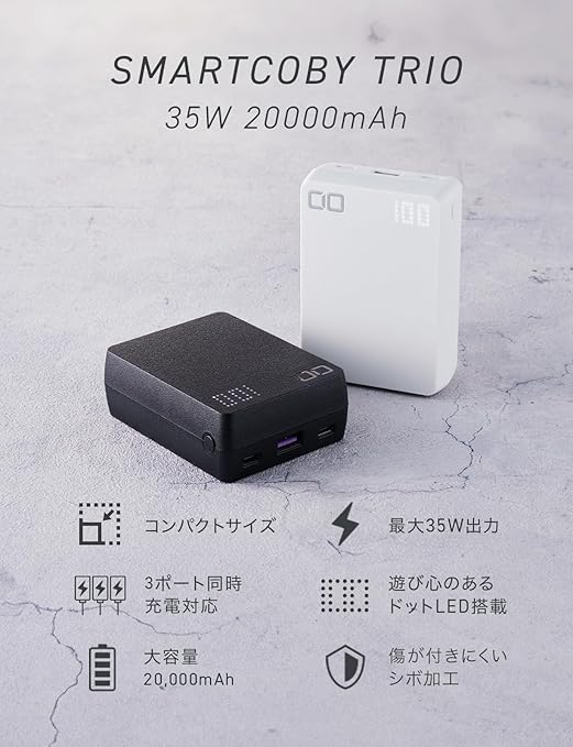 CIO モバイルバッテリー 大容量 20000mAh PD 30W 小型 軽量 急速充電 3ポート パススルー iPhone 15 / 16 /Android/Macbook/Windows ノートPC SMARTCOBY TRIO 35W 2C1A (ホワイト) a