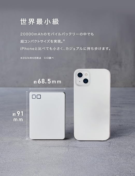 【毎日使える安心のモバイルバッテリー】20000mAhは大きくて重い。そんな常識を覆す程、コンパクトで軽量なモバイルバッテリー。従来の20000mAhモバイルバッテリーと比較し、約3分の2の体積を実現(CIO製品との比較)。コンパクトなフォルムにもかかわらず、iPhone15なら約3.5回、Galaxy S24なら約3.0回。あらゆるデバイスを複数回充電可能です。毎日のお出かけに、旅行に大活躍します。