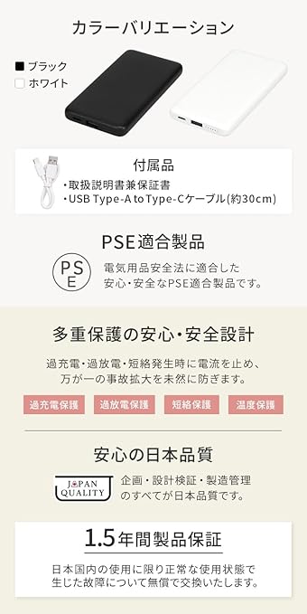 急速充電が可能な薄型モバイルバッテリー:本製品は厚さ14.2mmの薄型モバイルバッテリーです。iPhone 15 Pro Maxとほぼ同じサイズ感で、実用性と携帯性を両立しています。最大15W入出力に対応したUSB Type-Cポートで、モバイルバッテリーの充電、接続したスマートフォンの充電、ともに急速充電が可能です。充電回数と携帯性のバランスが取れた容量10000mAh:容量が10000mAhあり、スマートフォンを約3回満充電できます。※iPhone SE(第3世代)を充電した場合の充電回数で