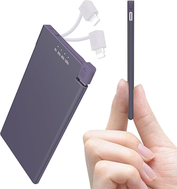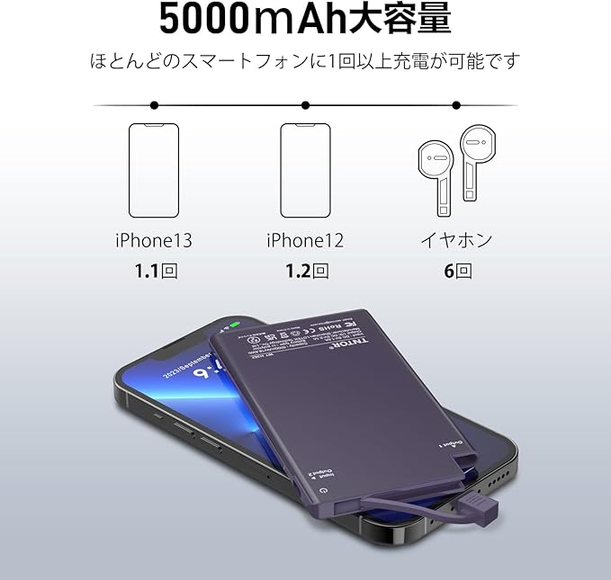 TNTOR モバイルバッテリー 軽量 小型 5000mAh iPhone 14/13/12/11/XS Max/XR/X/8/7/6/Plus Airpods対応 スマホ充電器 超薄 6.8mm ケーブル内蔵 iPhone対応 持ち運び便利 地震/災害/旅行/出張用【PSE認証済】紫色 a
