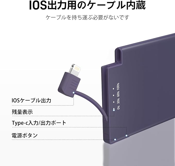 Lightingケーブル内蔵:出力用のケーブルが内蔵されています。別途ケーブルを用意しなくてもすぐにスマートフォン充電を利用できます。外出時にモバイルバッテリーを一つ携帯して快適に使っています。※申し訳ありません