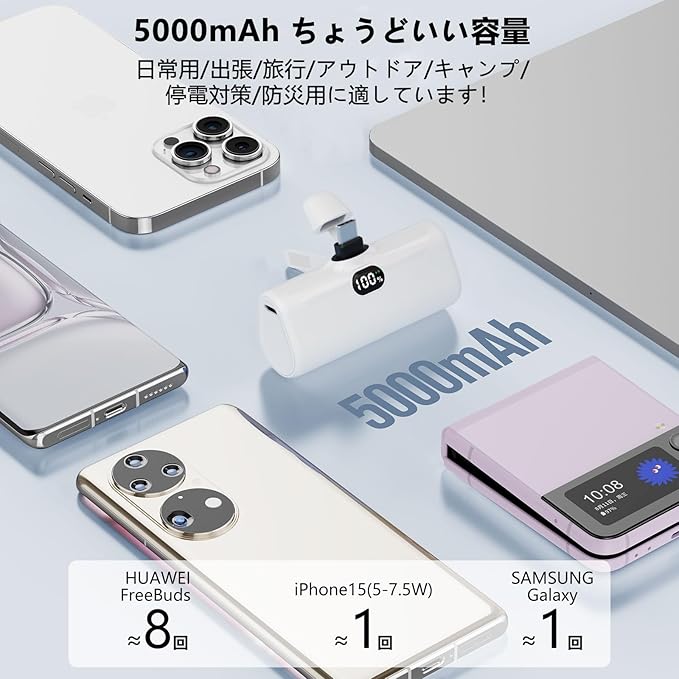 LUCKYDUO モバイルバッテリー 軽量 小型 5000mAh Type-Cコネクター内蔵 コードレス コンパクト 直接充電 急速充電 LCD残量表示 LEDライト&スマホホルダー付き Android用iPhone16/15/Xperia/Galaxy/Pixel/HUAWEI/ゲーム機など充電対応 PSE認証済(ホワイト) a
