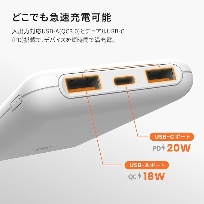 USB-Cポートを介した20W PD高速充電、USB-Aポートを介した18W QC3.0高速充電に対応 *高速充電は、一度に1つのデバイスのみ接続可能です。 **PD充電は AndroidおよびiOSデバイスに対応/QC3.0充電はAndroidデバイスのみに対応します(一部のHuaweiやOPPOモデルを除く)。