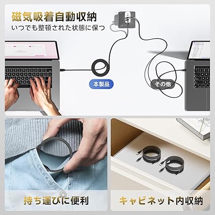 【磁気吸着自動収納】強力な磁石を内蔵し、ケーブルが自動的にきれいに整理されます。充電中でも、わずか1秒で簡単に収納でき、必要に応じて長さを最大1mまで調整可能です。コンパクトでスリムなデザインは、収納も簡単で、家でも外出先でも非常に便利に使えます。