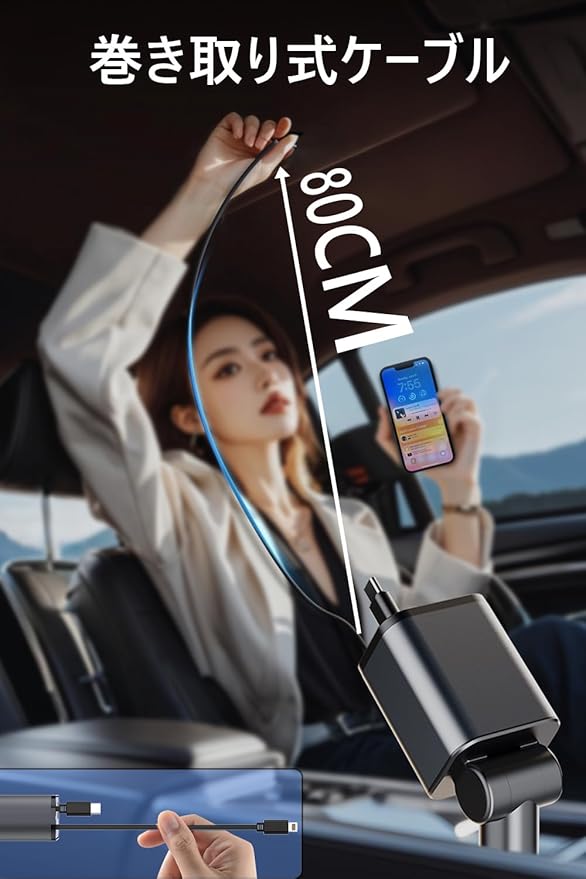 【超コンパクト4in1車載充電器】5.4*4.5cmx3.8cmの超コンパクトサイズと金属設計を採用し、製品の質感や雰囲気が高いです。また、180度回転するシガーソケットにより、車内のどこからでも手軽に充電できます。運転席や助手席、後部座席など、どの位置からでも使いやすく、角度を簡単に調整できるので、使い勝手が良く、快適な車内での充電体験を提供します。