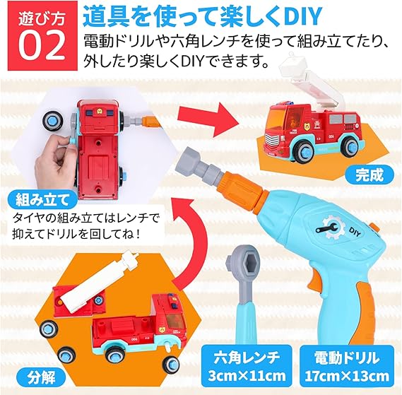 ラジコンとDIYおもちゃを組み合わせた商品です。消防車の組み立てやメロディ、ラジコンが楽しめます。