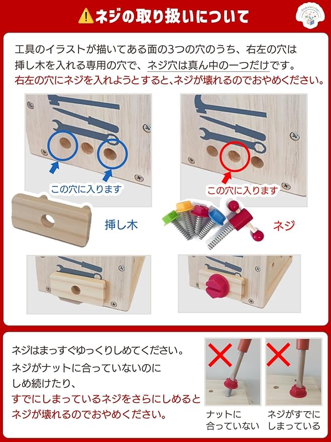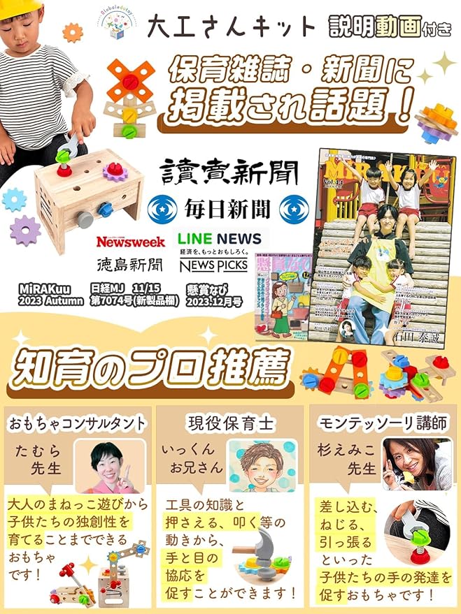 【モンテッソーリ講師&おもちゃコンサルタント&人気保育士推薦】大工さんキットでは日常生活では行わない動作を実践します。”差し込む、ねじる、ひねる、たたく”という動作は指から腕までの子供が自分の体をコントロールする練習に最適です。