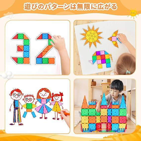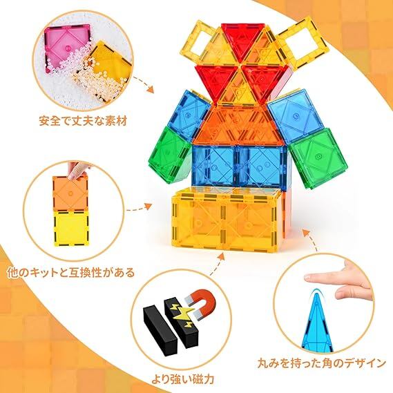 磁力アップ、新デザイン:64 ピースすべてに磁石が搭載されています。強力な磁力により、もっと簡単かつ迅速にしっかりとした作品を作ることができ、簡単に崩れることはありません。新たにデザインされたラインで、引っかき傷を防ぎ、長期間にわたり鮮やかな色となめらかな表面を保つことができます