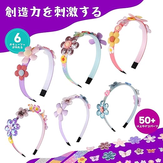 「カチューシャメイキングトイ」このカチューシャメイキングトイは、女の子たちの夢を叶えるおもちゃです。可愛いデコパーツとキラキラテープを使って、自分だけのカチューシャを手作りできます。夢中になりながら作る過程で、創造力が広がり、彼女たちの想像力を引き出せるでしょう。