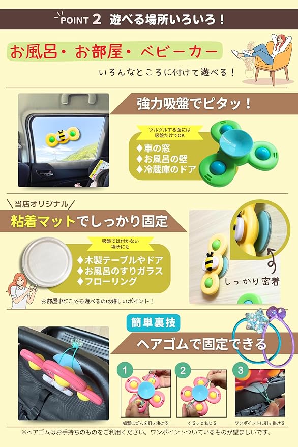 【いろんな場所で大活躍】吸盤で貼り付けられるのはもちろん、「粘着マット付き」なので貼り付けられる場所が広がります!さらに髪ゴムなどを吸盤に括り付けることでベビーカーなどにも取り付けられます!