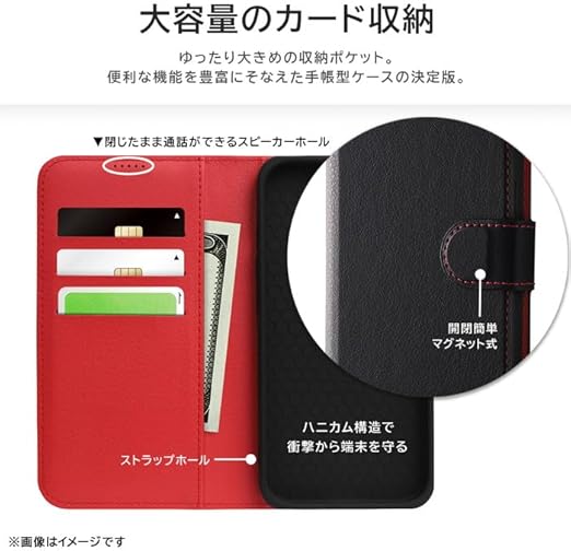 ケースを付けたままカメラ撮影可能 / カメラ穴 くり抜き カメラ / ケースをつけたまま撮影できる 撮影可能 カメラ撮影に便利 / 収納ポケット付き / レシートなども入れられる大きめの収納ポケット付き / カードポケット 大容量 2枚 3枚 4枚 / ICカード カードケース ポイントカード / 軽量設計 スリム 軽量 軽い 軽量で薄い 薄い 薄型