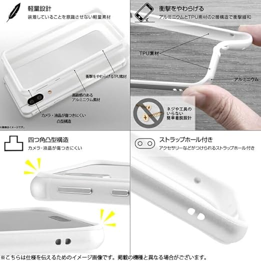 アルミニウム素材とTPU素材の二層構造。カメラ・液晶が傷つきにくい四つ角凸型構造。高級感のあるアルミニウム素材。ネジや工具のいらない簡単着脱設計。衝撃をやわらげるTPU素材。