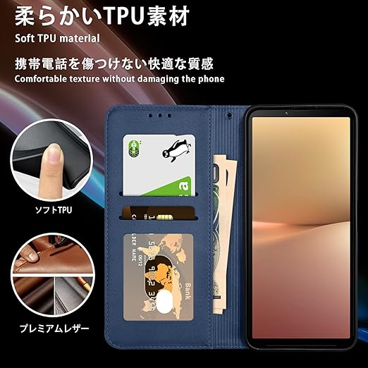 【適用機種】Sony Xperia 10 V (SO-52D SOG11)専用ケース に対応なので。※購入前に対応機種をご確認よろしくお願い致します。外部のカバーは高級感が溢れるPU合皮を採用して、肌触りがよくて耐久性もよく、あらゆる方向からの衝撃、しっかりと本体を保護してくれます。TPU素材を採用、柔軟性が高く着脱が簡単で変形しにくく、ベタつかず適度な柔らかさで触り心地が良い。