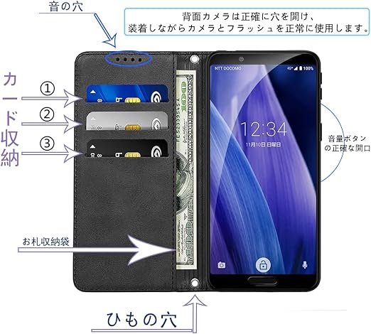 AQUOS Sense3 ケース 手帳型 高質PUレザー AQUOS Sense3 カバー SH-02M ケース SHV45 ケース SH-RM12 携帯カバー 気質 斜めショルダーストラップ付き(長さ調整可能)マグネット内蔵 自吸式開閉 カード収納 スタンド機能 肩掛け 便利 財布型 軽量 防水 耐摩擦 耐衝撃 全面保護 携帯ケース(ブラック) a