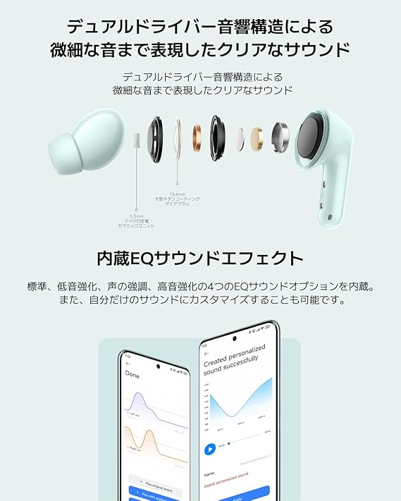 【デュアルドライバー、微細な音まで表現】アップグレードした12.4mmの大型ドライバーと5.5mmのツイーターを搭載したデュアルドライバーシステムを採用。それぞれの音域を分担することで、低音の迫力と高音の伸びやかさを両立させ、よりバランスの取れたサウンドを実現。さらに、映画やTVの視聴に最適な3Dオーディオを搭載し、まるでその場にいるかのようなリアルなオーディオ体験を提供します。