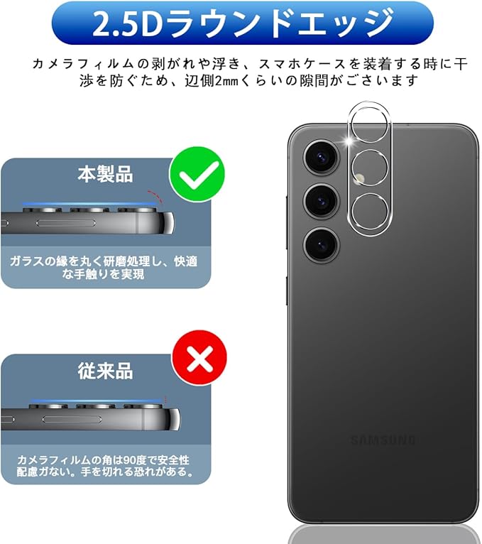 【飛散防止可能の9H硬度】 対応 ギャラクシーS24 5G レンズフィルム カメラ保護フィルムはす旭硝子で作られており、レンズ保護フィルムの中で最高レベルの9H硬度に達しています。手にフィットして持ちやすく滑りにくいので落ちにくいです。万が一落ちてもカメラフィルムが衝撃を吸収してくれるので、レンズ損傷を最低限まで抑えられます。また、特殊な飛散防止設計により、ガラスが割れても