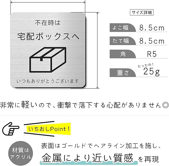 かたちラボ サインプレート 不在時は宅配ボックスへ 置き配OK シルバー ステンレス調 屋外OK 銀 シール式 日本製 a