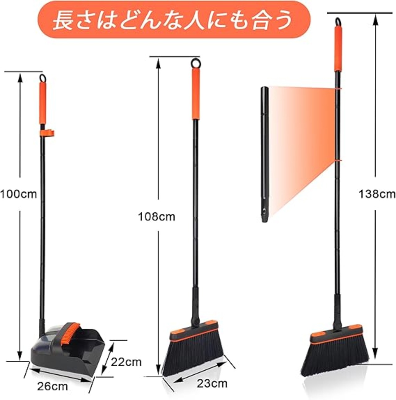 JEHONN ほうきちりとりセット,108cm-138cmロングハンドル軽量180度回転自立掃除道具,防風塵取り室内玄関ホーム庭園ショッ落ち葉プ最適(ブラックオレンジ) a