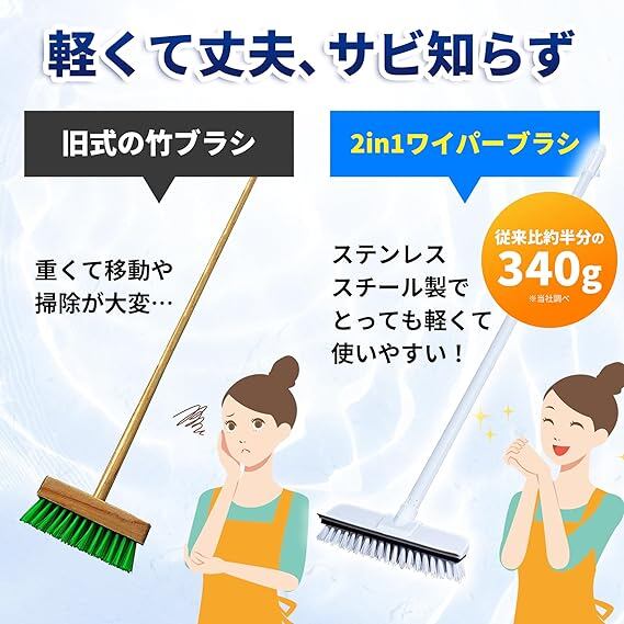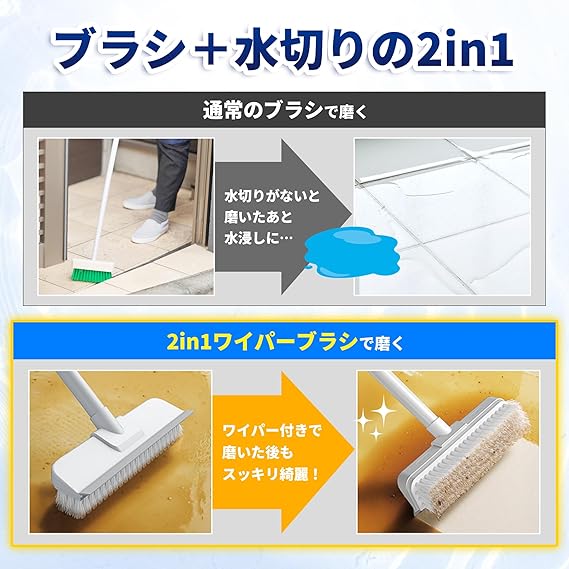 【めざましmedia掲載】 デッキブラシ ワイパー付き 2in1 伸縮式 3段ポール 高圧洗浄 丈夫な硬め毛 浴室 ベランダ 玄関 床掃除 壁掛け収納 粘着フック付 SKR CLEAN db-1 a