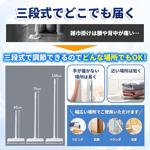 【3段階伸縮】持ち手の本数で長さ調整OK。浴室から玄関・屋外まで対応。