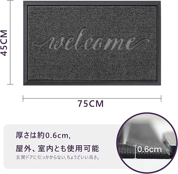 DEXI 玄関マット 屋外用 室内 迎え WELCOME 泥落とし 吸水 滑り止め 耐久性 おしゃれ ラバー エントランス お店 家庭用 業務用 45x75cm グレー a