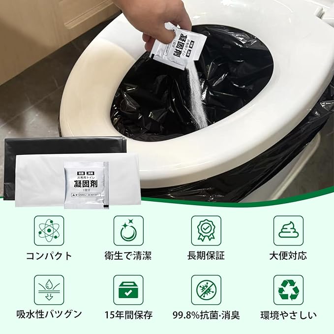 【非常用トイレ凝固剤×高吸水性ポリマー | 15年保存の必須防災備蓄アイテム】 100回分セット(凝固剤100袋+排泄袋20枚+超大防臭袋2枚):アルミ個包装により、湿気や外部衝撃を完全に防ぎます。高吸水性ポリマー配合で、800mlの液体をわずか20秒で固形化。コンパクトなデザインで、持ち運びも便利。