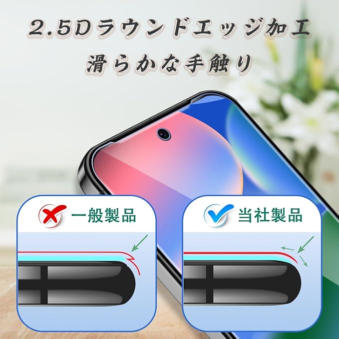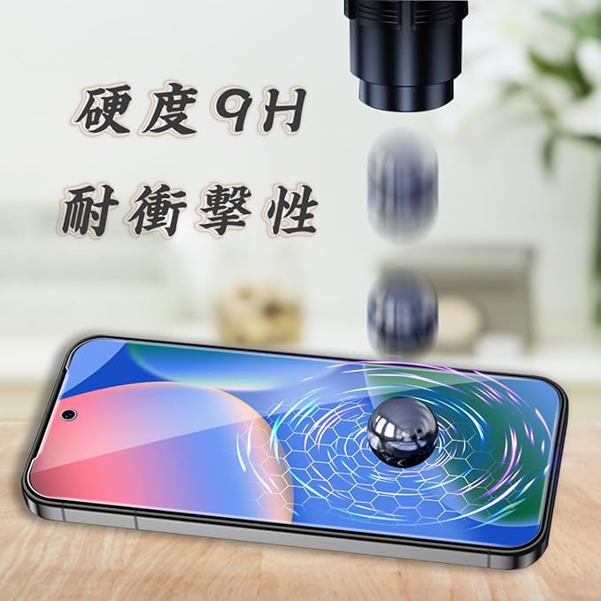 【日本製旭硝子製素材】表面硬度9Hと非常に高い硬度の持つ素材を採用し、外部の衝撃を吸収し、画面への損傷を最小限に抑えることができます。縁にかかる衝撃が軽滅しガラスフィルムの耐久性にも向上させます。特殊な