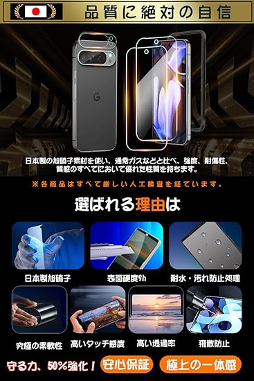 【日本旭硝子素材製・硬度9H超え】 Pixel 10 Pro XL 保護フィルム. (高品質 日本製素材,気泡の侵入を防ぎ、簡単に貼り付けることができます、 ガラスフィルムは非常に滑らかです。)業界 最 高レベルの9H硬度を有し、4.5時間以上の高温クエンチ処理を受け、スクリーンプロテクターは、通常のガラスよりも5倍高い125MPaの圧縮強度を持っています。 9H硬度を持つガラスにハードコーティングが施されることにより、フィルムは外部衝撃を吸収できる、画面へのダメージを最低限まで抑えました。あな