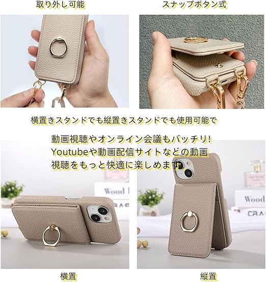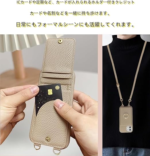 タイプリング付きスマホケース ショルダーバッグ風にも首掛けにも出来る大人可愛いストラッブ付スマホケース。調節可能お好みの長さに調節可能、長さ調整可能63~123cm、肩掛け、首か