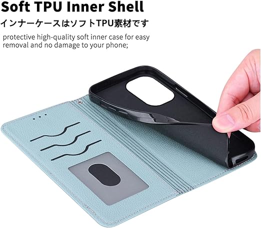 【特徴1:高品質PUレザー】軽量化のスマホケースです。外側カバーには滑り止めのライチ模様のPUレザーを採用します。内側のホルダーは柔軟なTPU素材を採用したソフトケースです。汚れにくくて指紋防止の特徴を持っております。耐衝撃の二重構造で落下の衝撃をうまく吸収します、本体をしっかりと守ります。
