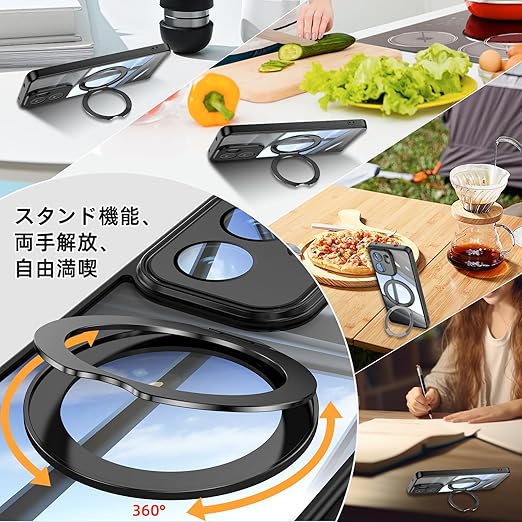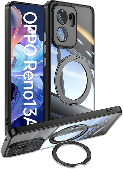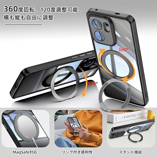 [ShinKin] スマホケース OPPO Reno13 A 用 ケース カバー 透明PC + TPU素材 ケース リング付き カバー スタンド機能 スマホケース 透明レンズフィルム保護機能付き 強化された保護 携帯電話のレンズフィルム 軽量 耐衝撃 擦り傷防止 落下防止 車載ホルダー 360°回転 ケース OPPO Reno13 A 用 (ブラック) a