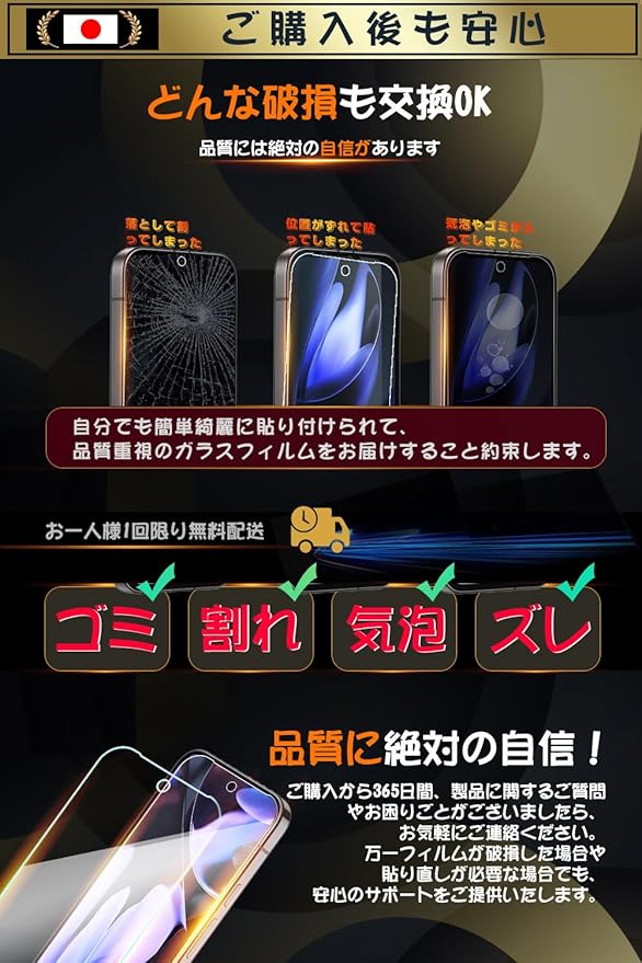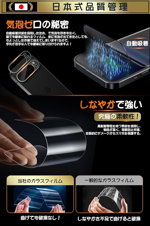 【日本旭硝子素材製・硬度9H超え】 Pixel 10 Pro 保護フィルム. (高品質 日本製素材,気泡の侵入を防ぎ、簡単に貼り付けることができます、 ガラスフィルムは非常に滑らかです。)業界 最 高レベルの9H硬度を有し、4.5時間以上の高温クエンチ処理を受け、スクリーンプロテクターは、通常のガラスよりも5倍高い125MPaの圧縮強度を持っています。 9H硬度を持つガラスにハードコーティングが施されることにより、フィルムは外部衝撃を吸収できる、画面へのダメージを最低限まで抑えました。あなたの大