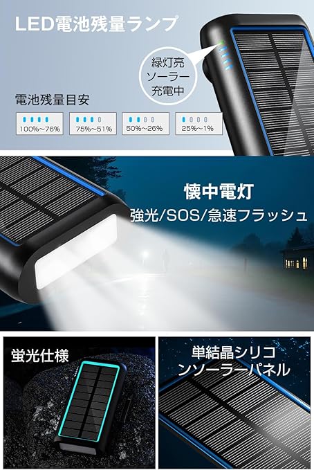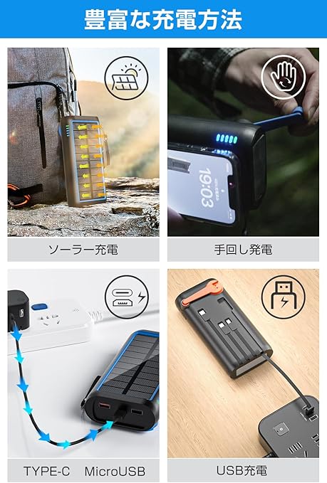 ソーラーモバイルバッテリー 手回し充電 【2025新登場 & 急速充電・22.5W/PD18W 】 ソーラーチャージャー 61200mAh 防災士監修 4本ケーブル内蔵 Type-C モバイルバッテリー ソーラー IPX7防水 耐衝撃 携帯 スマホ充電器 LEDライト付き 停電対策 SOSモード 地震/災害/旅行/アウトドア iPhone/Android各種デバイス対応 (ブルー) a