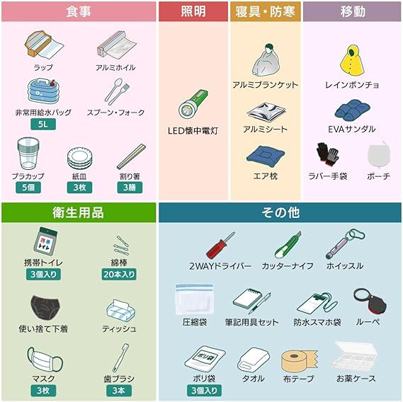 ●セット内容2:21.携帯用トイレ、22.ポリ袋、23.ラバー手袋、24.圧縮袋、25.布テープ、26.2WAYドライバー、27.カッターナイフ、28.お薬ケース、29.ポーチ、30.筆記用具セット、31.ルーペ、32.防水スマホ袋、33.使い捨て下着