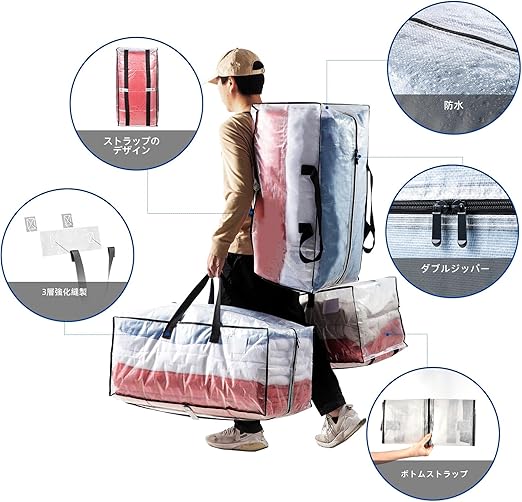 TAILI 大型収納袋 引越しバッグ 布団収納カバン 特大容量 ビッグバッグ 寝具ケース 持ち手付き 洋服 衣装ケース 羽毛ふとん 防塵防水 折りたたみ式 省スペース 引っ越し 背負える キャンプ 旅行 耐荷重 透明 4個セット a