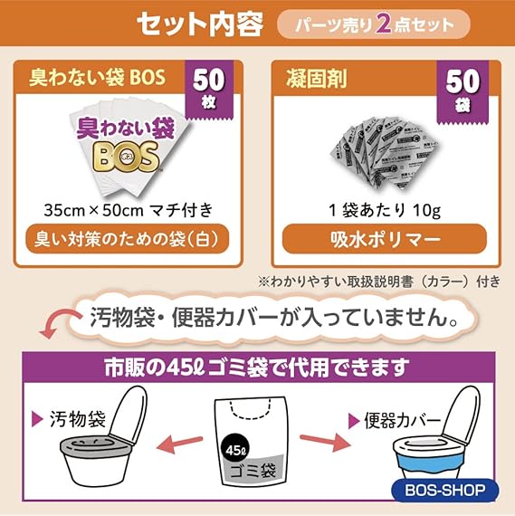 【BOS-SHOP限定品】非常用トイレパーツ2点【防臭袋BOS・凝固剤の2点セット】15年保存 50回分 防災グッズ 災害 簡易トイレ 携帯トイレ【排泄臭の根本解決はBOSだけ】 a | yorozuyah