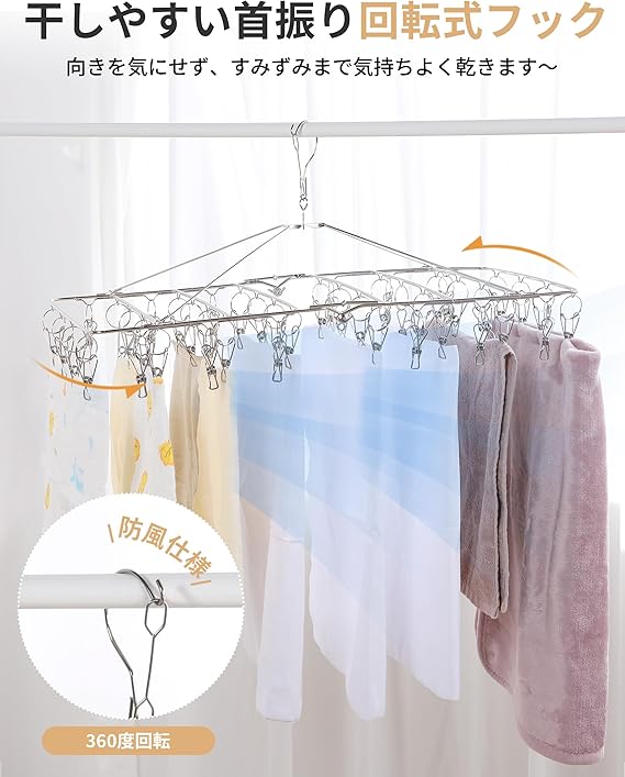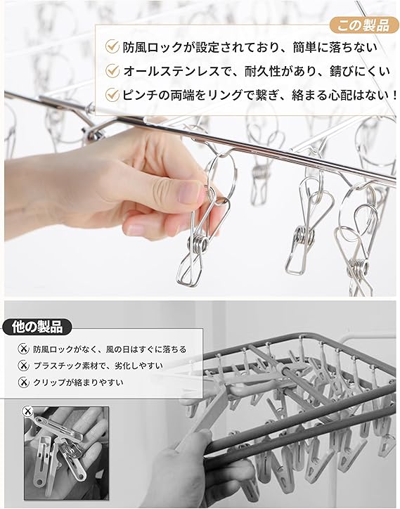 「竿からの落下を防止」風が吹いてもピンチごと飛ばされないよう落下防止のステンレスストッパーがついています、風の日も心配なく干すことができます。